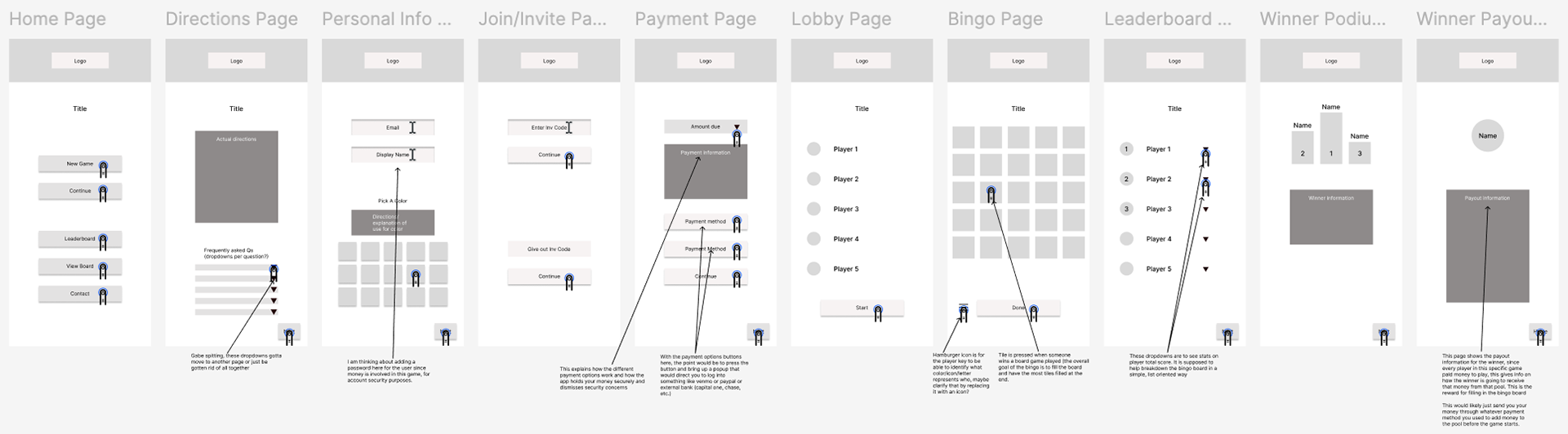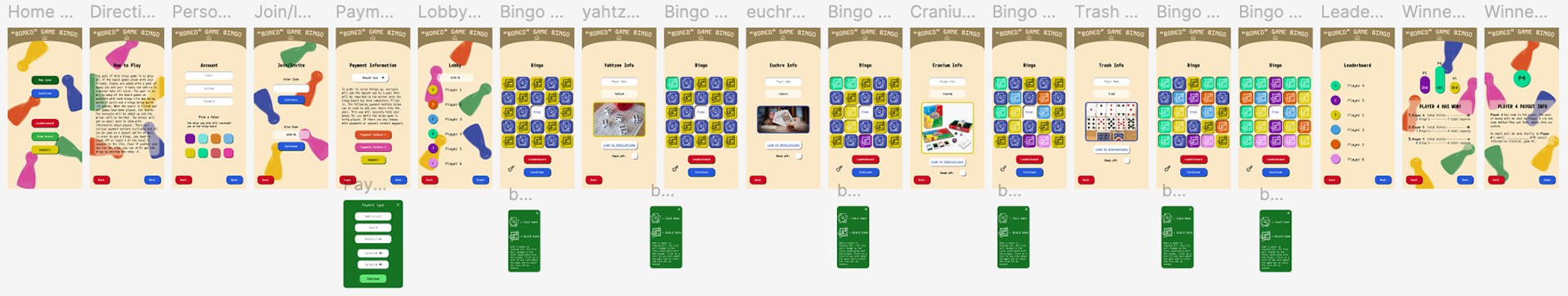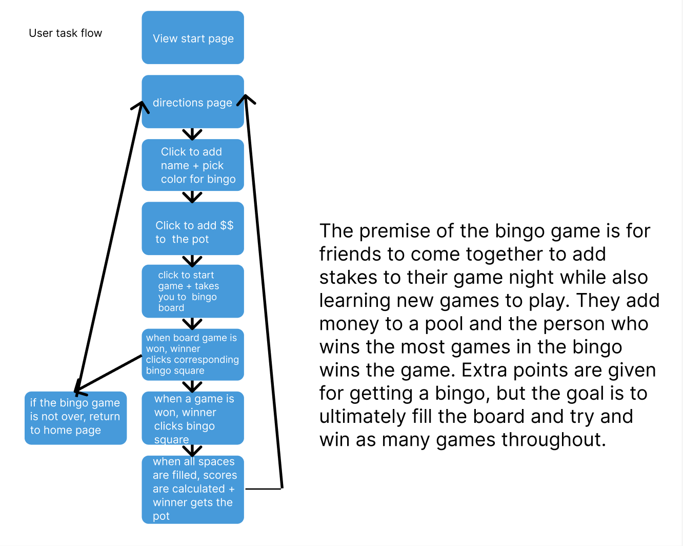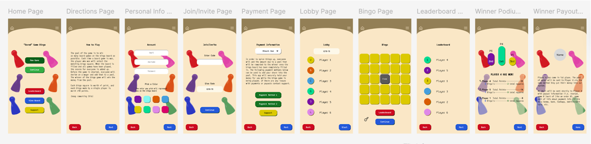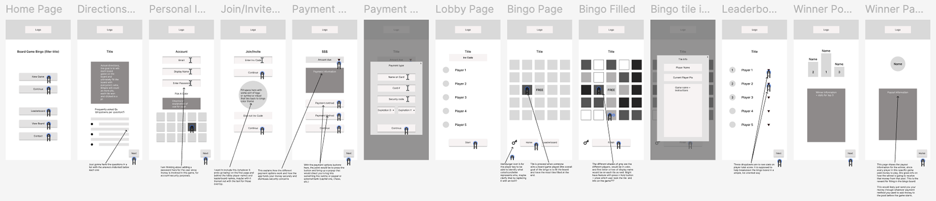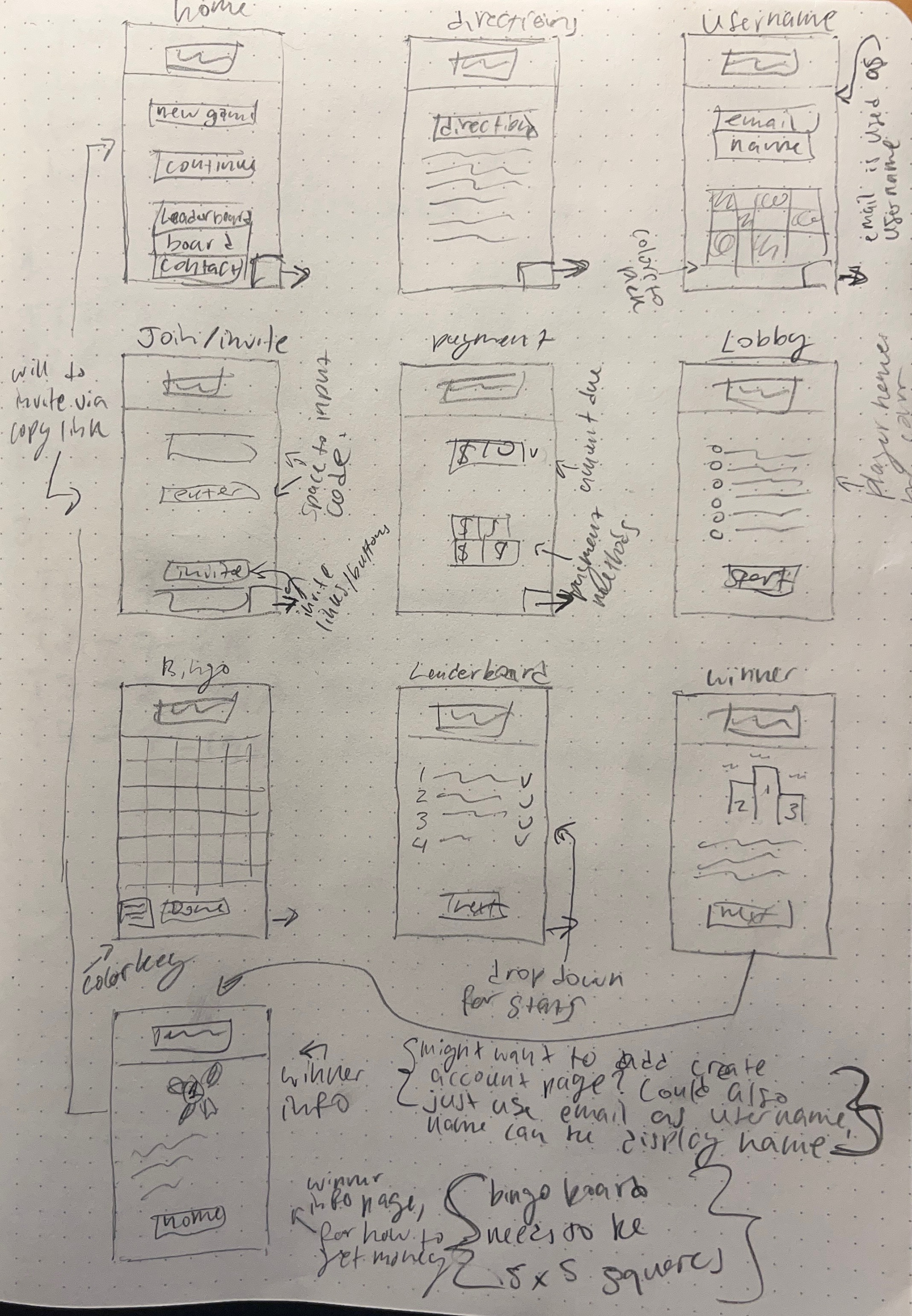 I started with this user task flow (shown above) to figure out what pages I should have and what each one should do. I then took that task flow and sketched out this layout for the pages for the bingo game. Each step of the process brought new challenges and changed the flow and amount of pages in this taskflow.