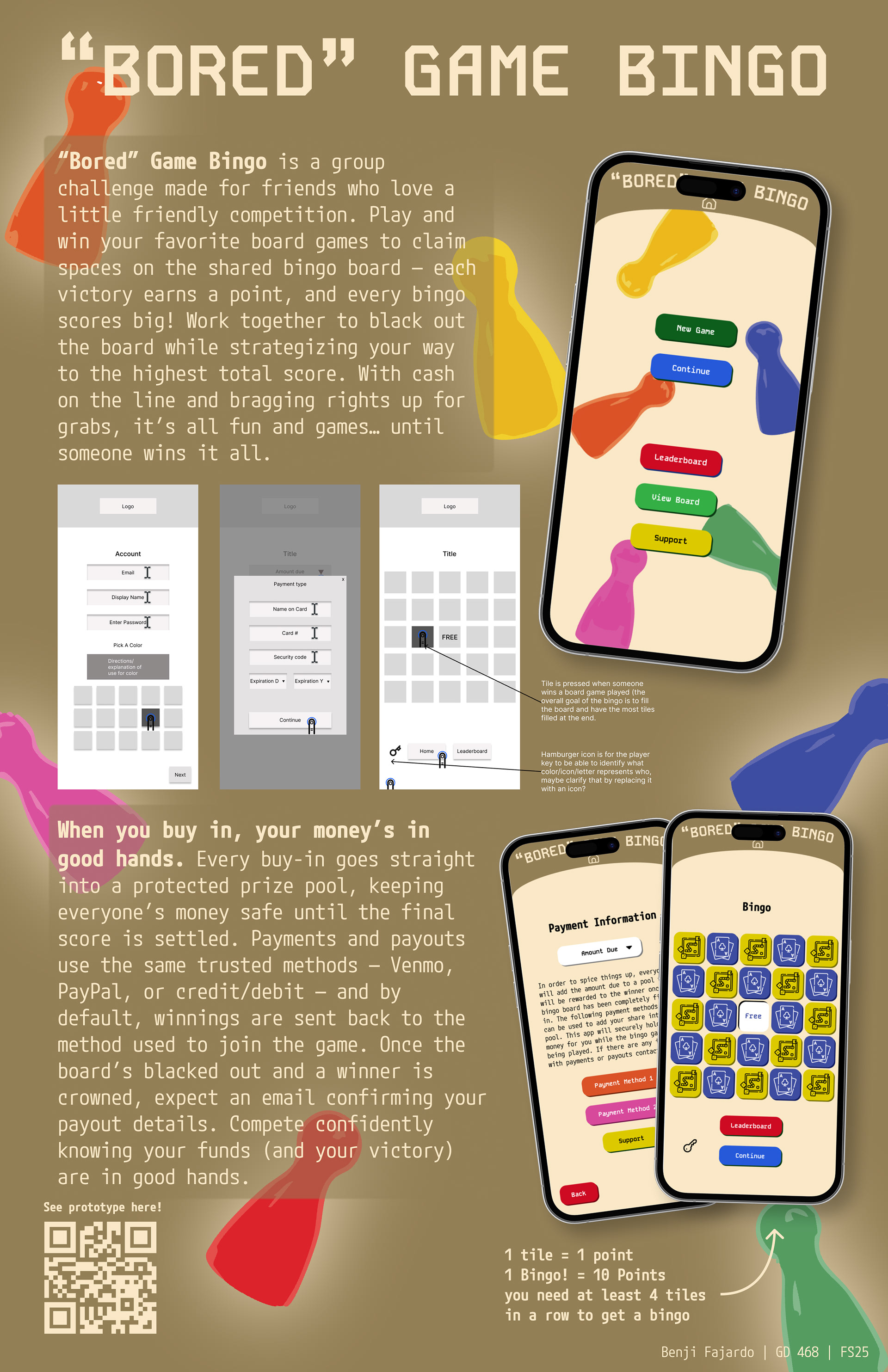 The idea came to me to make a board game bingo because I was struggling to continuously play interesting board and card games with my friends. I decided to make a bingo game that is multiplayer in which the players try to play and win a variety of board/card games. The goal is to win as many board games since each time someone wins one of the games they mark the bingo board off. A single tile selected is worth 1 pt while a bingo is worth 10. The goal is to get as many points as possible before the entire board is filled. Once the board is filled, whoever has the most points is declared a winner.