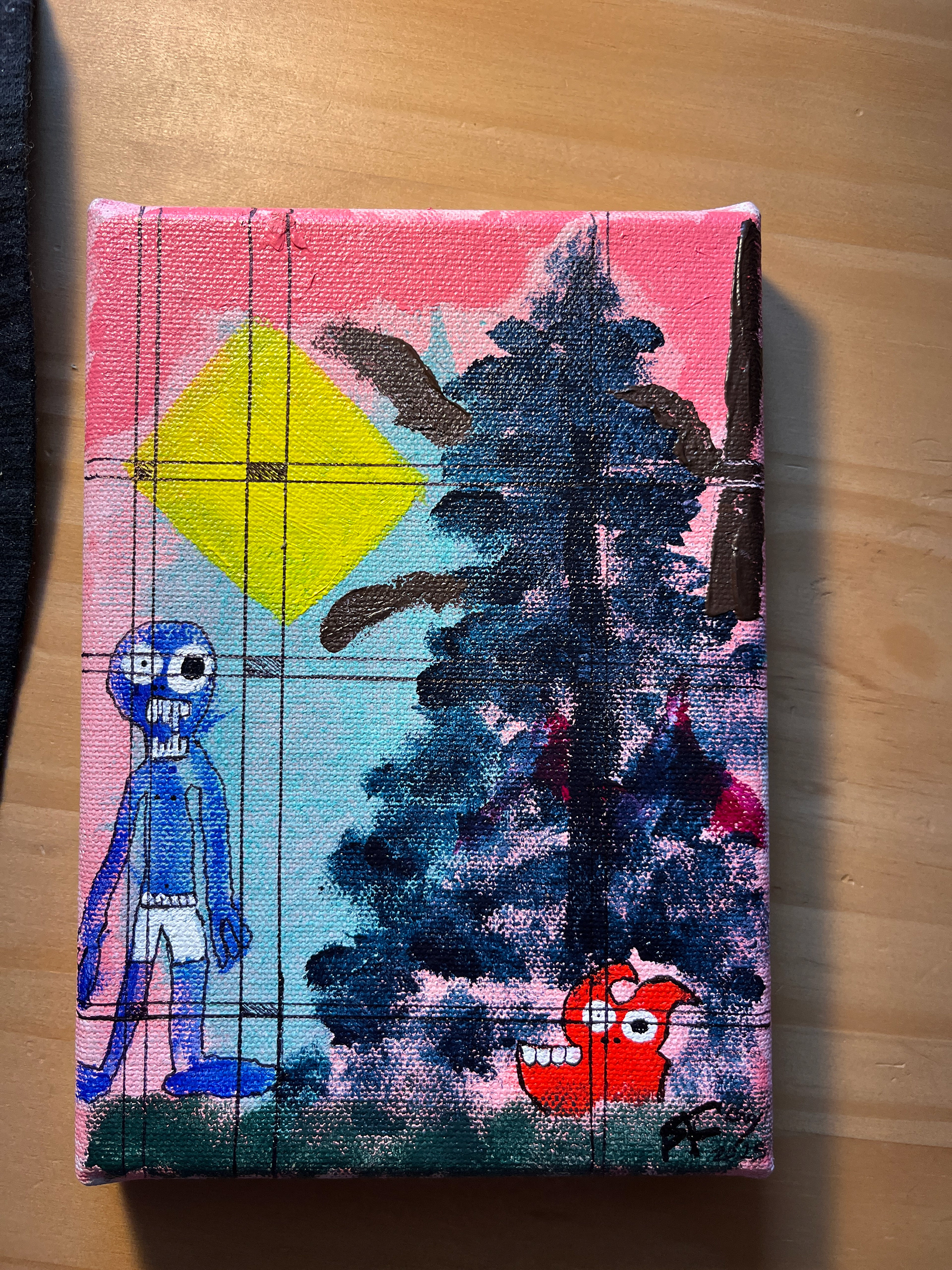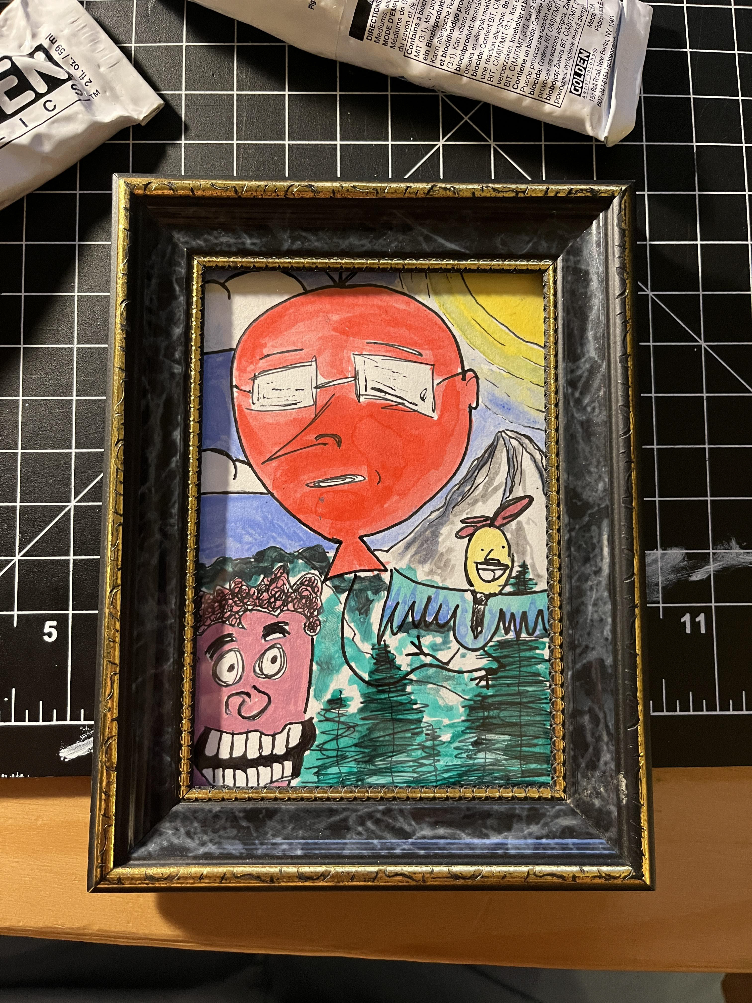This was the first version of the Weónes series, and I was once again playing around with my paints out of boredom during the summer of 2025. I was doodling and watching a Bob Ross videos a bunch at the time had and I basically decided to doodle some figures into a Bob Ross-type background. I used acrylic paint for this one, but I watered it down a lot to try and give it more of a water color type of feeling (I did not have any water color paints at the time). I found this beautiful frame at the thrift store, and it happened to fit the piece perfectly, so I decided to put it in there. I also used Sharpie for crisp outlines on everything.