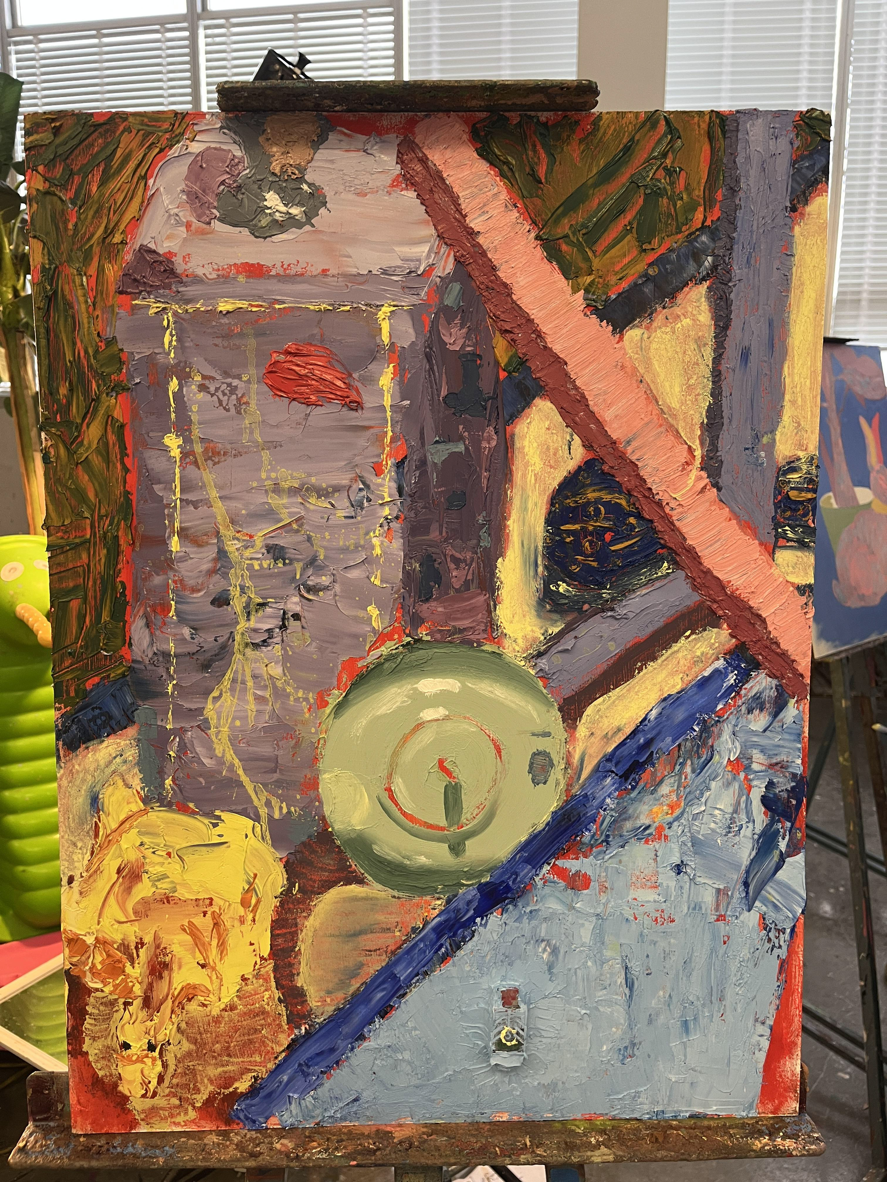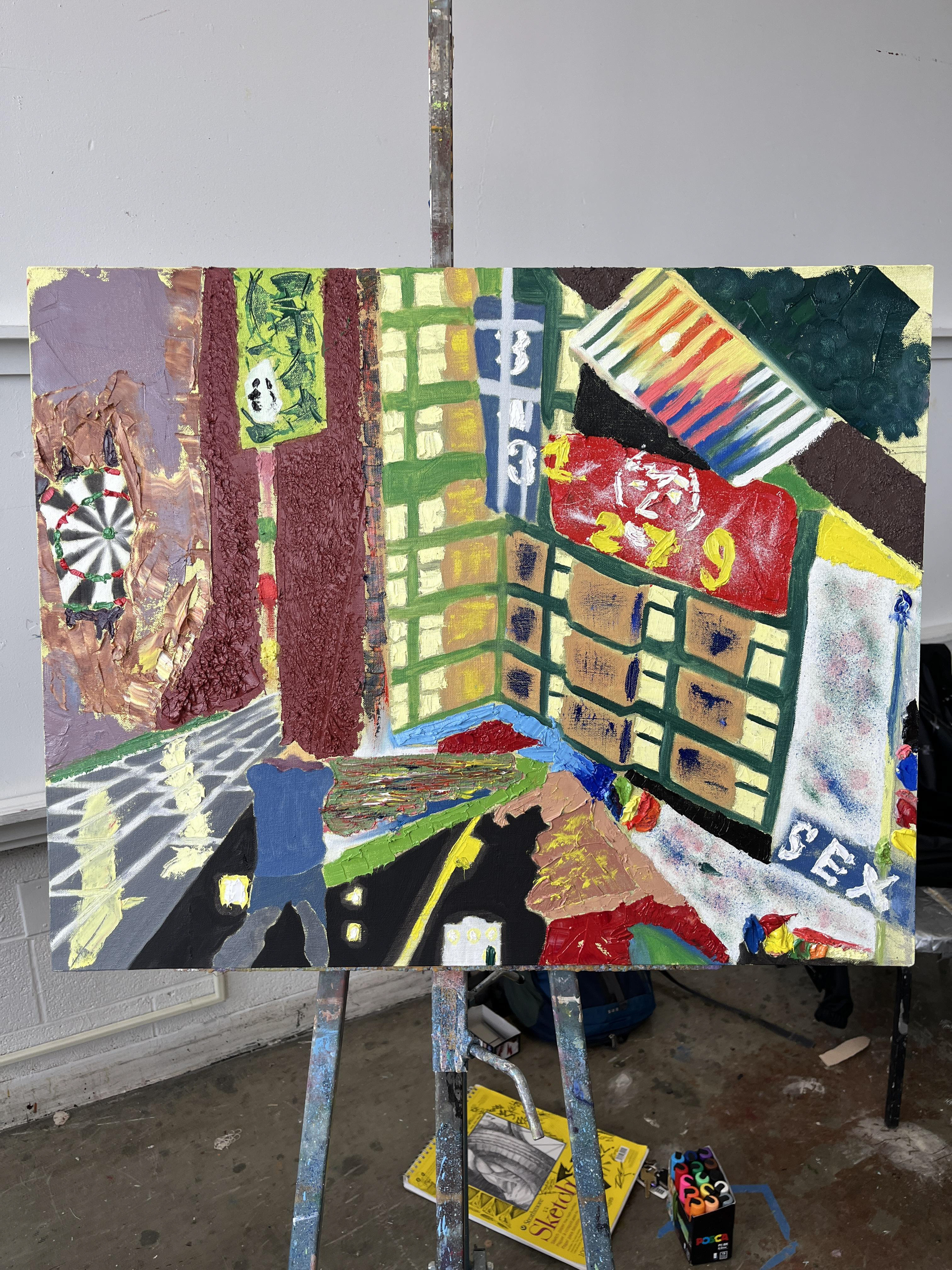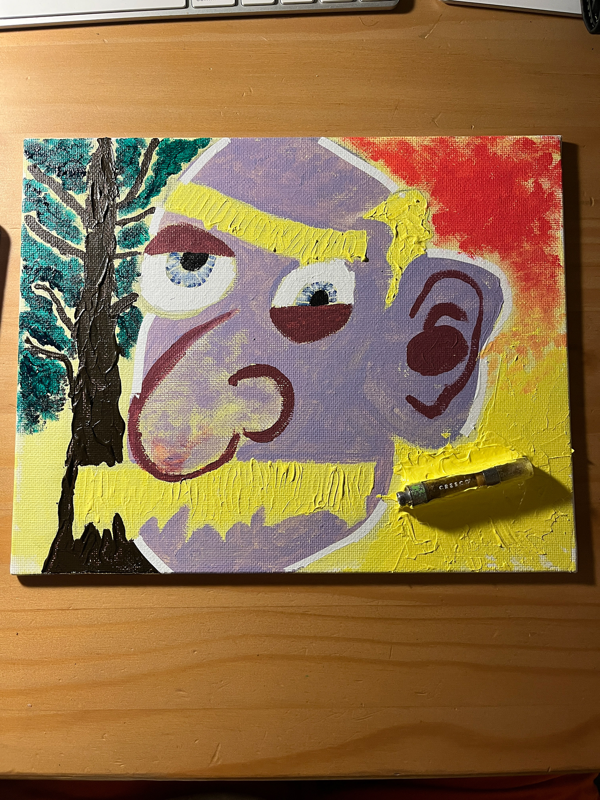 This was another piece I made out of boredom during the summer of 2025, and was also a form of stimulation and entertainment. I used acrylic paints and a whiteout pen along with embedding a Cresco Cart into the painting that I had found on the ground on the way home that day.