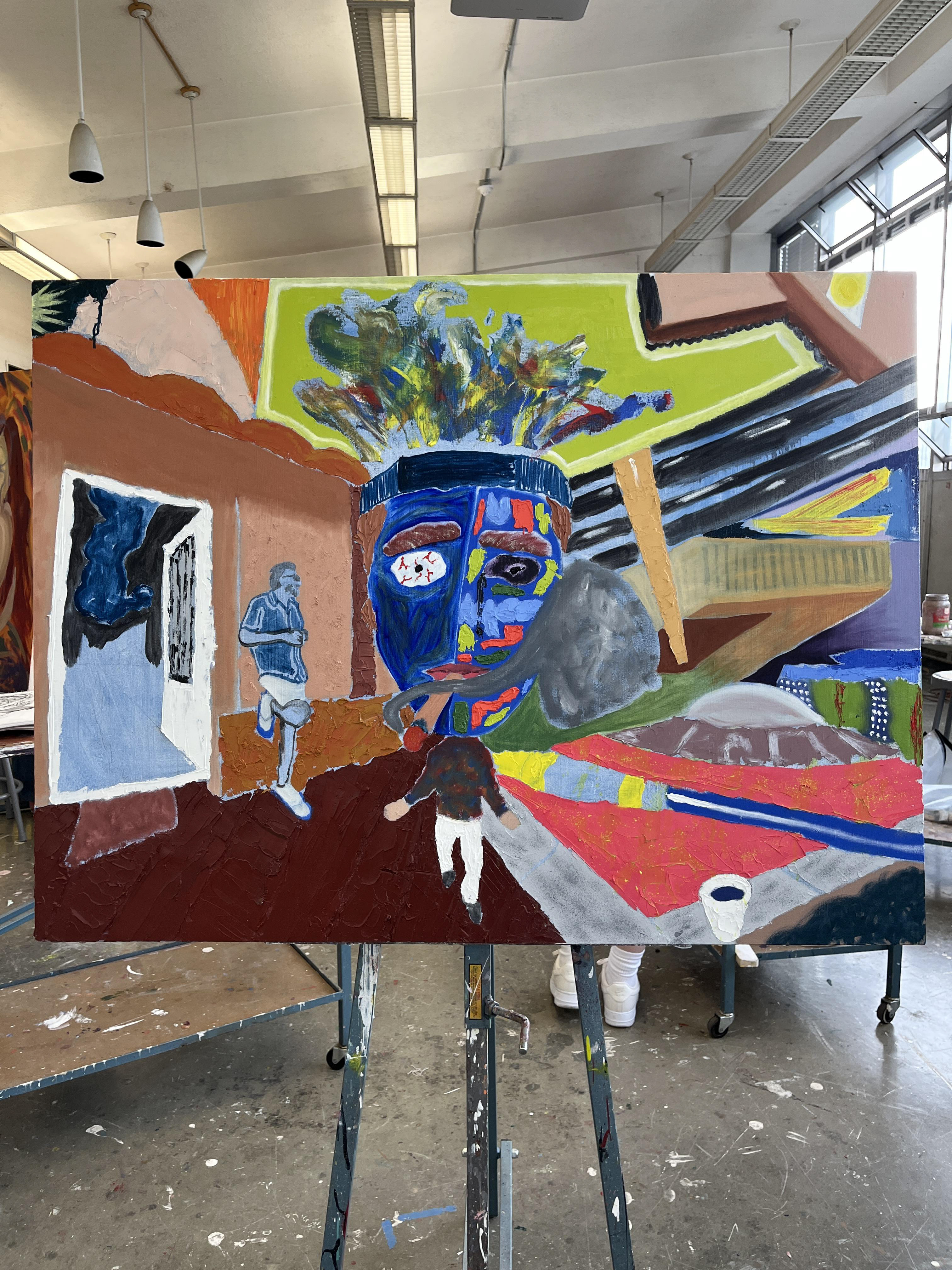 I also started this piece off by making a digital collage, then tracing it and painting over the traced image. This piece has much more significance to me because it is meant to reflect my feelings of loneliness and my abuse of marijuana to try to escape from the loneliness. This was my second summer back at home (Arlington, VA), and most of my close friends had not come back for the summer. I was missing my friends from school as well, and my parents were busy working their 9-5 jobs. I was working a job at Outback Steakhouse that I hated, and I was smoking every day, multiple times a day, to try to escape the reality I had found myself in. I was also closing myself off from anyone who was close to me and supported me (especially my family). I did, however, go to Barcelona and Madrid with my family this summer, and it single-handedly kept me from breaking down and going off the deep end. All of the imagery used in the digital collage was from that summer, coming from both the trip to spain and images I had taken back home. This piece is meant to reflect that state of high that I was constantly chasing and was seemingly the only thing I was able to enjoy on a daily basis.