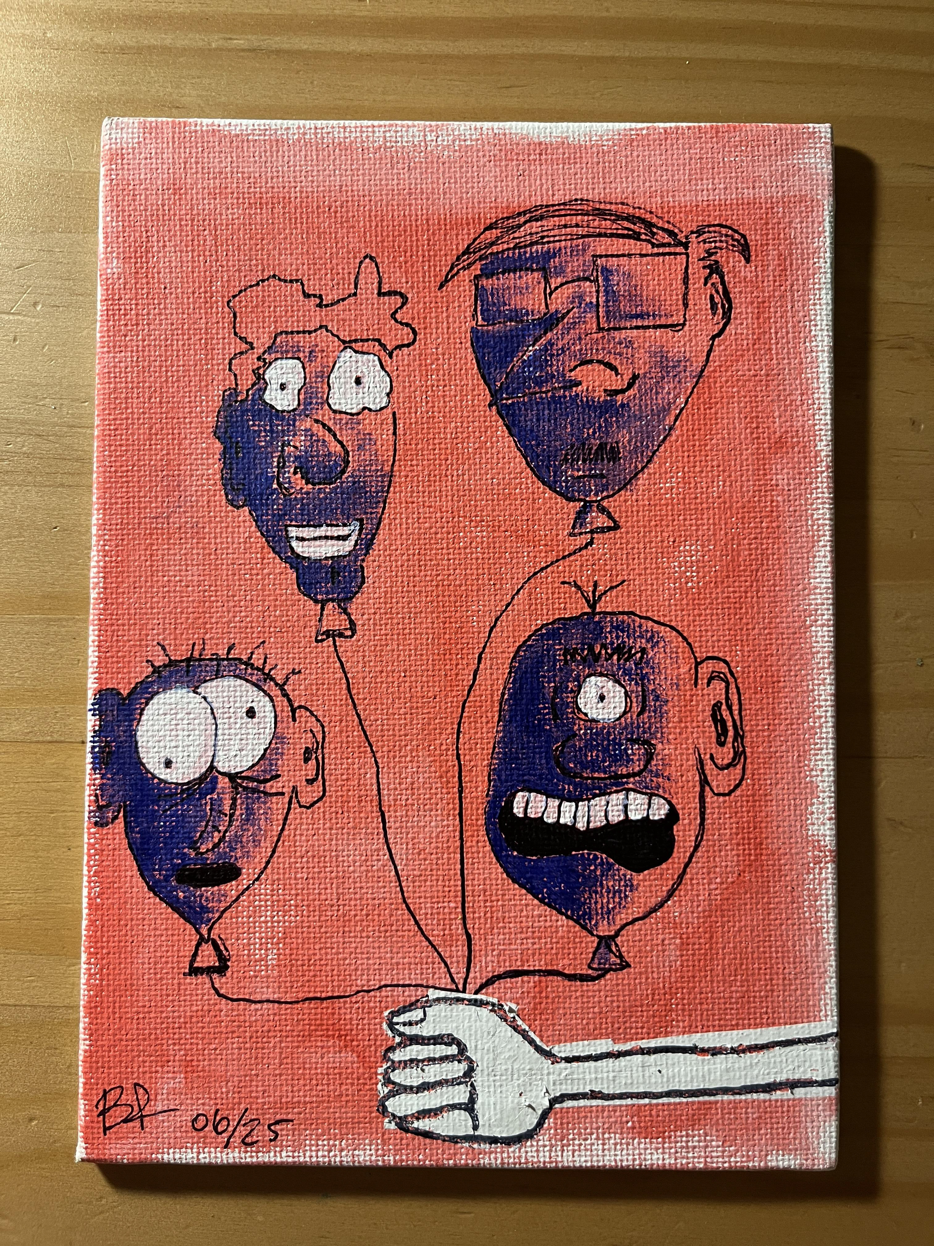 My father and I have always joked about Weónes (a Chilean slang word). He and I used to doodle a variety of caricatures with exaggerated features. I was bored during the summer of 2025 and decided to make some Balloon Weónes. This was made with acrylic paint, sharpee markers, and the whiteout pen. This was more conceptual and just for fun than anything.